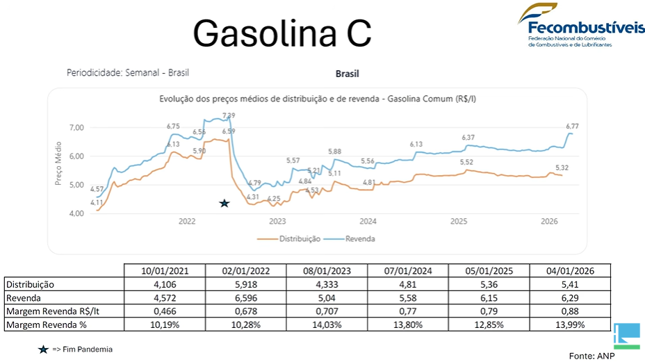 Dados públicos da Agência Nacional do Petróleo, Gás Natural e Biocombustíveis (ANP) demonstram como o preço de revenda da gasolina C acompanha fielmente o preço de distribuição — para cima e para baixo. Ressalta-se: na pandemia, quando os preços nas distribuidoras caíram, os postos também reduziram seus preços, sem reter margem adicional.