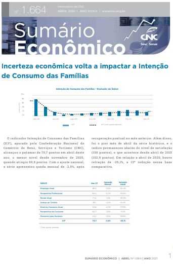 Incerteza econômica volta a impactar a Intenção de Consumo das Famílias – O indicador Intenção de Consumo das Famílias (ICF), apurado pela Confederação Nacional do Comércio de Bens, Serviços e Turismo (CNC), alcançou o pata mar de 70,7 pontos em abril deste a no, o menor nível desde novembro de 2020, quando atingiu 69, 8 pontos. Com o ajuste sazonal, a série apresentou queda mensal de -2 , 5% , após recuperação pontual no mês anterior. Além disso, foi o pior mês de abril da série histórica , e o índice permaneceu abaixo do nível de satisfação (100 pontos), o que acontece desde abril de 2015 (102 ,9 pontos). Em relação a abril de 2020, houve retração de -26,1% , a 13ª redução nessa base comparativa.