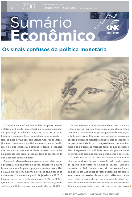 Com maior inflação em cinco anos, serviços abrem 2022 em queda – Segundo a Pesquisa Mensal de Serviços (PMS), divulgada em 16/03 pelo Instituto Brasileiro de Geografia e Estatística (IBGE), o volume de receitas do setor de serviços recuou 0,1% em janeiro de 2022 ante o mês imediatamente anterior, já descontados os efeitos sazonais. O resultado mensal veio próximo à expectativa da Confederação Nacional do Comércio de Bens, Serviços e Turismo (CNC), cuja projeção era de variação de -0,3%. Já na comparação com o mesmo mês do ano passado, o setor registrou expansão pelo 11º mês consecutivo (+9,5% sobre janeiro de 2021).