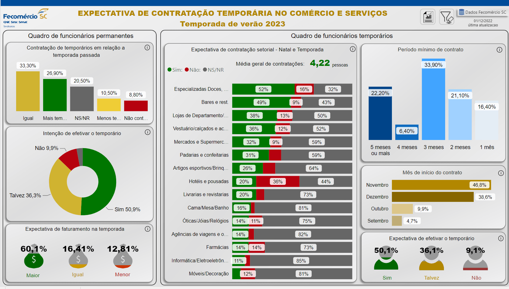 Pelo menos27% dos empresários têm a intenção de contratar trabalhadores temporários, 62,5% deles pretendem manter o colaborador extra por três meses ou mais. A chance de efetivação também é significativa: metade das empresas afirmou que o trabalhador pode ser contratado definitivamente após o fim do contrato temporário.